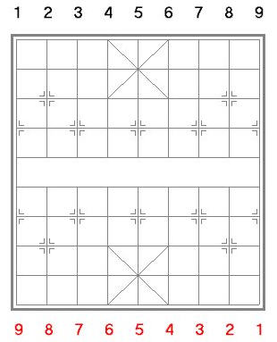 盤にはその上と下に数字がふられている。その数字が棋譜を読む際に重要なのだ。先手も後手も1は右手側から始まっている。また、欧米では上下とも英数字だが、中国と日本では上は英数字だが下は漢数字になっている。例で説明しよう。