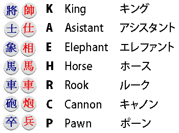 画像はシャンチーの駒だ。その下には盤がある。駒にはそれぞれの駒を1文字で表す英字記号と英字名称、読み方の説明がある。拡大して見てほしい。K(King)、A(Asistant)、E(Elephant)、H(Horse)、R(Rook)、C(Cannon)、P(Pawn)だ。