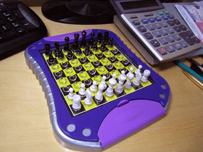 研究 用にチェスの小型セットを買った。ダイソーで税込み420円だ。サイズは235mm×185mm(縦×横)でデスクサイドに置いておける。旅行用にもよさ そうだがハデハデなのがちょっと恥ずかしい。チェスは今まで並べて研究などしたことはないが、このハデハデがきっかけになればと思う。