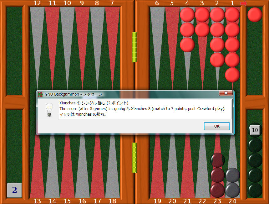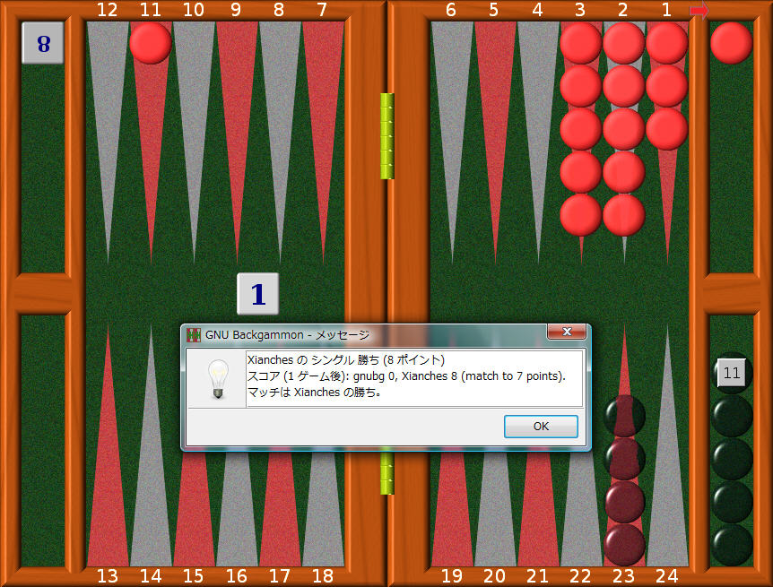 まだそんなことやってるのかって?そりゃそうだ。わたしはしつこいのだ。7、8ゲームを戦い25ポイントマッチで勝つという目標を目指しながら gnubg の手を学んでいるのだ。
