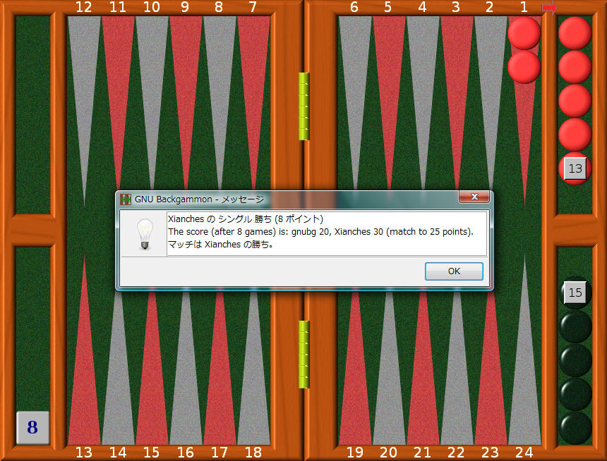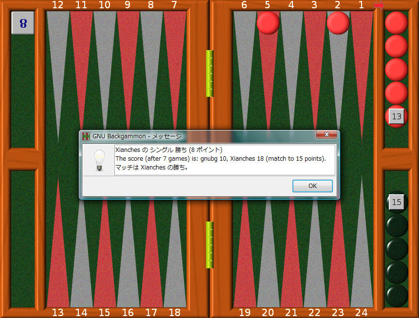 まだそんなことやってるのかって?そりゃそうだ。わたしはしつこいのだ。7、8ゲームを戦い25ポイントマッチで勝つという目標を目指しながら gnubg の手を学んでいるのだ。